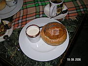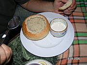 A tu ja się nie zgadzam. Bo nie ma co porównywać wspólczenych chlebków-talerzy z takowymi ze średniowiecza. Wówczas zapewne i sam środek (nie - zupa) i "talerz" był zjedzony. A jakoś nigdy w erstauracji nie widziałem jedzących takie "talerze", sam zaledwie parę razy skubnąłem przykrywkę. No i - niech ktoś z Was się przyzna, czy zjadł całośc i zagospodarował wnętrze??????????