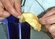 Jeszcze gorace krazki skladac na polowe tak aby brzegi lekko zachodzily na siebie nastepnie odwrocic i nagiac formujac jakby pierozek.