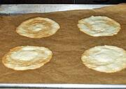 Z ciasta wyciskac krazki o srednicy 5 cm, na blache wylozona papierem pergaminowym.