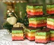 Piekarnik nagrzac na 180 stopni C. Wysmarowac maslem prostokatna forme o wymiarach 33/23 cm,wylozyc dno papierem pergaminowym /przydadza sie trzy arkusze,po jednym na kazdy placek, dwa konce papieru pozostawic dluzsze,beda pomocne przy wyjmowaniu plackow z formy. Bialka ubic na sztywna piane, stopniowo dodajac 1/4 filizanki cukru. Przelozyc do innego naczynia. Paste migdalowa miksowac z 1/2 filizanki cukru w ciagu 2 minut. Dodac maslo i ubijac do uzyskania jasnej,pieknej masy - 3 minuty. Dodac zoltka i esencje migdalowa, kontynuowac ubiajanie jeszcze 2 minuty. Dodac make i sol, dobrze wymieszac. Dodac bialka /w 2 porcjach/ do masy i dokladnie wymieszac lopatka. Rozdzielic ciasto na 3 czesci, do jednej czesci dodac czerwony barwnik, do drugiej zielony, trzecia czesc pozostawic biala. Czerwone ciasto wylozyc do formy i wyrownac lopatka /grubosc ciasta ok.7 mm/. Piec 8-11 minut /placek powienien upiec sie ale nie powinien sie przyrumienic/ Jesli w kuchni jest goraco to zielony placek nalezy na czas pieczenia czerwonego placka wlozyc do lodowki. Wyjac upieczony placek z formy - za wystajace konce papieru i przelozyc do ostygniecia ,a podstawke w formie kratki. Forme wytrzec papierowym recznikiem, wysmarowac maslem i wylozyc pergaminem. Wlozyc do formy biale ciasto, piec tak samo jak poprzedni placek. To samo powtorzyc z zielonym ciastem. Placki wystudzic. Wylozyc blaszke do pieczenia pergaminem /lub stolnice/,przewrocic na nia zielony placek "do gory nogami", zdjac papier na ktorym piekl sie placek. Posmarowac go polowa dzemu morelowego. Obrocic bialy placek na zielony,posmarowany dzemem,zdjac papier, posmarowac reszta dzemu. Przykryc obroconym czerwonym plackiem, zdjac papier. Przykryc wszystko folia,, na wierzchu polozyc blache lub deseczke, lekko przycisnac. Wstawic do lodowki lub wyniesc w chlodne miejsce na 8 godzin. Wyjac placki z lodowki, zdjac folie i pozostawic by sie ogrzaly do pokojowej temperatury. Rozpuscic 1/2 czekolady w wodnej kapieli. Wylac czekolade na placek i szybko rozsmarowac. Wstawic do lodowki do zastygniecia na ok. 15 minut. W tym czasie rozpuscic reszte czekolady. Wyjac ciasto z lodowki, przykryc pergaminem, na wierzchu polozyc blache do pieczenia lub deseczke. Obrocic. Szybko posmarowac czekolada zielony krazek. Wstawic do lodowki na 30 minut. Obciac brzego ostrym nozem - najlepiej nozem-pila. Rozciac ciasto wzdluz na 4 paski a potem wszerz na kawalki 2-3 cm. Przechowywac w przykrytym naczniu, poszczegolne warstwy ciastek przelozyc papierem pergaminowym. Smacznego!