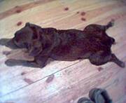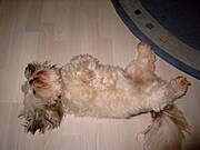 A tak mój piesek znosi upały. Kładzie się w przedpokoju na zimnej podłodze albo w łazience na kafelkach - wygląda jak żaba