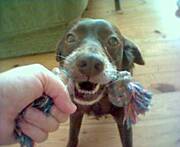 Moja suczka też uwielbia taka zabawę, a jak nie znajdzie kogoś chętnego do zabawy (czyt. jelenia z wolnym czasem :))) to przychodzi do mnie, kładzie mi pyszczek na kolanach i tak patrzy...., że za sekundę juz wariuje z kawałkiem linki i ze mną w roli drugoplanowej :)))) Ach te zwierzaki...