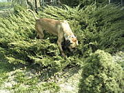 Zapomniałam opisać Wam bardzo ważne wydarzenie!!! Właściwie może nie tyle ważne co dość straszne, ach ten Leo, wywinął nam taki numer że wszyscy sąsiedzi stali na bacznosc( hm.. co niektórym to dobrze zrobiło). Siedzieliśmy sobie na kawce w ogrodzie z gośćmi ( mam dwa ogrody, jeden jest mój a drugi Leo), ogród mój jest naprzeciw moich okien od kuchni i wejscia do budynku i nagle słyszymy taki piskliwy głos mojej sąsiadki " Danka twój pies idzie do Ciebie", struchlałam!!!! No i rzeczywiście mój kochany bandzior, lata sobie przed bramką i tak raz do sąsiadki (biedna była blada jak prześcieradło), raz do sąsiada i jego psa (oni oboje stali bez ruchu) a ja latam za nim i nie moge go złapać!! Goście bali sie wyjść bo nie wiadomo jak zareaguje, dopiero mąż wpadł na pomysł i pobiegł po kolczatkę. Ja wpuściłam tego bandziora do swojego ogrodu( poszło troche kwiatków) i trzymałam biednego za łeb bo inaczej sie nie dało. W tym wszystkim najciekawsze jest to że pies był bardzo szczęśliwy a drzwi otworzyła moja kochana sąsiadka , która wchodzi bez pukania!! Leo nie atakował tylko ich witał serdecznie ale jak widzą takiego olbrzyma to nawet to witanie jest straszne. Och , jeszcze zachowanie mojej suni było takie , że zaganiała Leo do mojego ogrodu heheeh taka z niej mamuśka. Leonek sie wybiegał i był szczęśliwy.