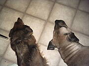 Moi kochani muszę Wam opowiedzieć historię , która zdarzyła się z kleszczami i burzą!!!! Leo dostał kapsułkę na kleszcze ale kleszcze sobie z tego nic nie robiły, właziły w ten ogromny łeb i wpijały sie, więc ja jak zawsze za przyrząd i dalej do usuwania (kleszcz podobno może być 24 godz i nic nie zrobi ale po 24 godz może zarazić)!! Za oknem gromadziły się chmury czarne - szła burza!! W domu też sie gromadziły i to chyba większe niz na zewnątrz!! Moja mała Pegi bardzo boi sie burzy!! Właściwie to wskakuje mi na ręce i tak musze ją trzęsącą nosić. Leo przygotowywałam do zabiegu ( nie życzę nikmu żeby jemu wyjmowałał kleszcza)! Tu burza się zbliża, zaczyna grzmieć a ja latam za moim Leo po domu próbując go złapać! Pegi lata za nami próbując wskoczyć mi na ręce, mąż przezornie zamknął sie w pokoju co by nie musiał mi pomóc (psy w czasie burzy bezpiecznie czują sie tylko przy mnie - tak mąż mówi hehehe). Wyjęcie kleszcza z głowy psa takich rozmiarów graniczy z cudem!!!! Cud niestety sie nie zdażył!! Leo był bardzo zdziwiony, że Pegi tak lata za mną !! Więc stwierdził , że on też może latać , no i role sie odwróciły!! Teraz dwa psy latały za mną!! W końcu piorun strzelił i cała trójka wylądowała na Leo posłaniu!! Psy leżały jak trusie , ja cała mokra, musiało to nieżle wyglądać, ja w srodku psy po moich bokach!! I tak czekaliśmy do zakończenia burzy!!! Oj!! Życzę sobie i moim psom żeby nie było burz wiecej!!! Kleszcz został usuniety następnego dnia po zaaplikowaniu środka uspakajającego !! pozdrawiam danka