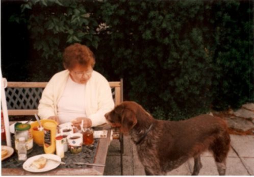 Ogromne dzięki za pozdrowienia i życzenia. Zdjęcia są robione na bieżąco, lecz niestety aparatem analogowym. Jesteśmy zwolennikami tradycyjnych zdjęć, które są z tyłu zawsze opisane i włożone do albumu. Oba wyżełki są brązowe z łatkami dereszowatymi. Kaktus ma niesamowite ślepka, bo koloru żółto-bursztynowego. Zaś mały Skuter ma jasno zielone z popielatym, też piękne. Jedyne zdjęcie Kaktusa można zobaczyć w informacji "o mnie". A jest on niewątpliwie najpiękniejszym i najmądrzejszym psem na świecie (oczywiście dla mnie). A numery, jakie "wycinał", to też niezły kawałek historii. Np. ściągnęł z kuchenki garnek z przygotowanymi buraczkami do obiadu, opędzlował wszystkie, garnek tak wylizał że nie było śladu po buraczkach i schował w kącie w kuchni.