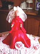 Spód tortu to wiśniowa delicja Ilki76, sukienka z masy marcepanowej basi19 a różyczki z masy cukrowej. Spódnica nałożona jest na biszkopt upieczony w formie na babkę. Mimo wczorajszego upału lalka nam się nie rozpłynęła, choć niewiele brakowało.