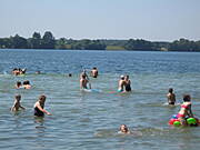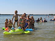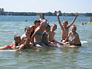 Drogę nad jezioro pokonaliśmy z wieloma przeszkodami ( mam problemy z orientacją w terenia i pogubiłam się w lesie, mimo, że 2 dni wcześniej pojechałam zobaczyć teren), bo zapomniałam jak dojechać do owego gospodarstwa agroturystycznego. Ależ od czego są telefony i zaprzyjaźniony pan Ludek, który ze stoickim spokojem powtarzał "tylko spokojnie pani Kasiu". Po chwilowym błądzeniu udało się- uff:). Kiedy dojechaliśmy na miejsce, dzieci mówiły "wiedzieliśmy, że sie uda, że Pani to zawsze fajne miejsce znajdzie" i szybciutko wskoczyły do wody, bo pogodę mieliśmy przecudną- 35 stopni.