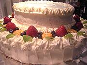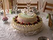 No niestety, tort zostal zjedzony.. a ja dostalam standing ovation!! az poczerwienialam !!! Trot byl w calosci zjadliwy.. dekoracje to byly truskawki, qumquats - te male pomaranczo-podobne owocki, zjadliwe wraz ze skorka. Zielone listki byly listkami miety. Dodam zdjecie przekrojonego torta.. juz nie wyglada tak ladnie! Krem z ktorego robilam wyciskane rozetki, to byl krem od Dr. Oetker taki podstawowy to tortow, waniliowy. Robi sie go dodajac mleka i masla do proszku. Jest kupny ale pewniak, bo nic nie zmienilo formy i pieknie wygladalo a w smaku tez bylo ok. Labedzie plywaja, po tym samym kremie, lecz z dodatkiem paru kropel likieru Curacao Blue... zeby woda byla niebieska. Tort wazyl wraz z podstawa na ktorej go zrobilam z jakies 3-4 kg.. aby go dowiezc na miejsce musialam sie niezle nagimnastykowac... przy kazdym zakrecie myslalam ze mi wyleci poza patere!!! ale udalo sie i wszyscy byli zachwyceni! Labedzie, byly z bezy zlepione bita smietana, oczka mialy namalowane sokiem z jagod a dziobki sokiem malinowym ;)