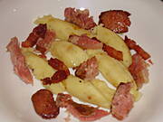 Te ziemniaki były nakładane łyżką bezpośrednio na talerz ,do tego podsmażona kiełbasa i boczek a zupa była podawana bez dodatku chleba.
