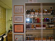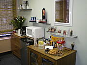 Tak, kawa jest zawsze, to chyba glownie dlatego, ze ja jestem kawoszem ;) a w dzbanku jest tez woda z cytryna (znow, ja sama nie bardzo lubie zwykla wode, a cytryna dodaje smaku) ciacha tez sa, ale one moga zniknac (to teraz glownie na czas otwarcia i swiat) natomiast zawsze sa jakies cukierki lub czekoladki....pozniej w miejsce ciastek beda orzeszki.... Musze pomyslec w przyszlym tygodniu o jakims wystroju swiatecznym - malutka choinka no i swiecznik zydowski na Hanukah. W tej wazie z czerwona wstazka sa bileciki na loterie swiateczna, kazda klientka, ktora przychodzi juz od teraz az do konca roku, bierze udzial w losowaniu obnizek cen na przyszlosc czyli moze to byc iles tam procent (z reguly od 5 do 20) taniej za rozne zabiegi, albo produkty i te bileciki maja byc wykorzystane do 15 lutego. Najbardziej wartosciowym jest polowa ceny za zabieg twarzy do wyboru w/g gustu czy upodobania klientki, ktora wygrala.... i taki bilecik jest tylko jeden :)) ale wszystkie co roku mieszaja w tym sloju z nadzieja, ze to wlasnie ona trafi na ten bilecik :))) No i jeszcze dopisze, ze wczorajsze klientki wszystkie dostaly prezent, a byl nim pensetka podswietlana do wyrywania niepotrzebnych wloskow brwi miedzy zabiegami regulowania... Wydalam tych prezencikow 18 sztuk :))) i jeszcze byla lampka wina, jak ktos mial ochote ...