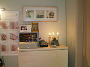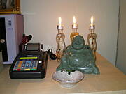 tutaj moje dyplomy i licencje - tego gornego "wariata" musialam pozniej przykleic, bo sie ciagle ruszal, chyba skakal z radosci na nowym miejscu :)) A kasy pilnuje posazek Buddy :))