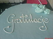 Gosiu Twoje prace są tak "dopieszczone" i piękne, że nie śmiałabym krytykowac :))) Może na dole przydałaby się jakaś dekoracja, może "powtórzenie" tej róży ? Ale nie wygląda to wcale głupio :), poza tym dekoracyjny brzeg napewno równoważy ten brak :))) Gratuluję. Będę chciała pod koniec miesiąca "obłożyć" taką masą tort (regalice już kupiłam) i jesli pozwolisz to chciałabym trochę "potruć" Ci i prosic o wskazówki przy wykonaniu :) Czym robiłas napis (w sensie - jakim narzędziem i materiałem:)