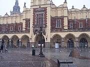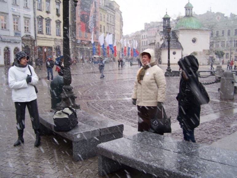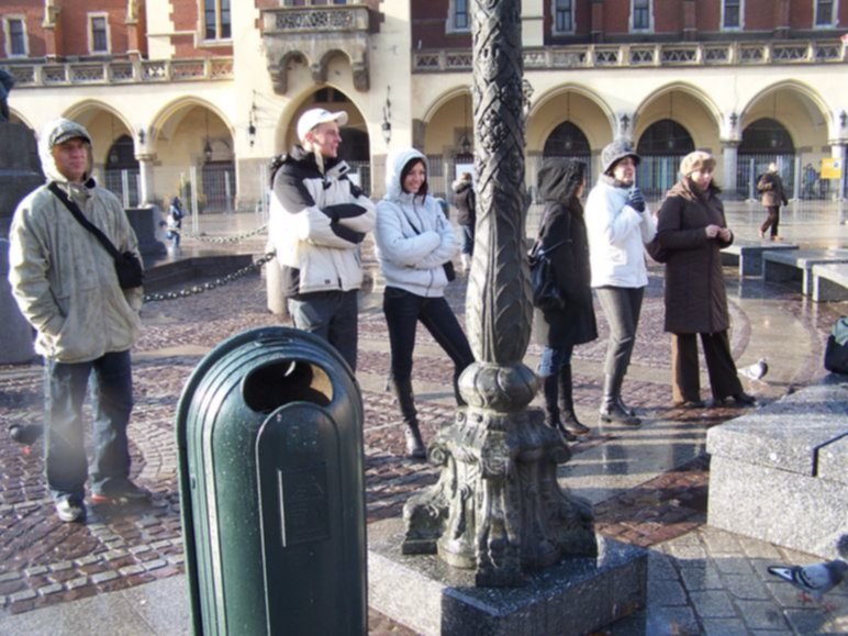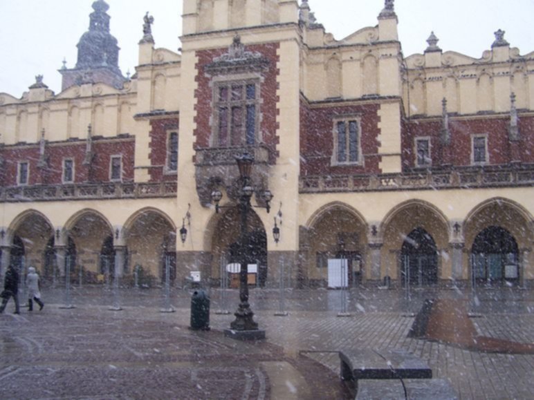 Jak widzicie Kraków przywitał nas sniegiemz deszczem i wiatrem. Przyjechałam jednak ze swoją rodzinką i punktualnie stawilismy sie pod Adasiem na Rynku Głównym. Żadnej grupy tam jednak nie było :( Pomyslałam, ze pewnie pogoda zniechciła innych do podróży i tyle. Okazało się jednak, że Żarłoczków nie tak łatwo zniechęcić :)))