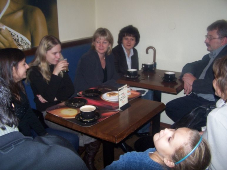 Wobec tego Oculta zabrała nas do Nest Cafe na pyszną kawke i ciacho.Było tak przyjemnie i cieplutko, że aż się wychodzić nie chciało :))) - od lewj Oculta, Wróbelek, Krysia64, Petra, towarzysz Petry, tyłem siedzi Kropcia i córczka Agnieszki Szylar
