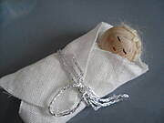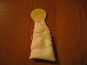 Najprościej i najszybciej, to tak: narysować na bloku technicznym głowke dzidziusia z aureolą, narysować zamknięte oczka, nosek, buźkę, pomalować kredkami i wyciąć tak, żeby pozostawić długa szyję -5 cm. Tę szyję owinąć kawłeczkiem białego materiału tak, żeby powstał becik. Przewiazać ten becik cieniutką wstążeczką i już :) Po południu wstawię zdjęcie.