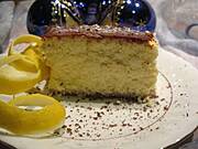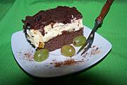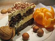 z masą orzechową i powidłami z czekoladą, oblany lukrem i posypany migdałami