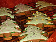 piernik a raczej pierniki tygodniowe : Choinki zostały przełożone masą marcepanową z dużą ilością amaretto a dzwony masą grysikową i powidłem. Z części ciasta upiekłam księżyce- te były przełożone powidłem i wersją eksperymentalną masy marcepanowej z dodatkiem soku z dzikiej róży, który miał zastąpić wodę różaną. Dla mnie niewypał a w każdym razie domowy sok z dzikiej róży nie może udawać wody różanej...:))) Ze zdziwieniem stwierdzam,że księżyce nie zdążyły pozować do fotografii... Wyszły sobie...:)))