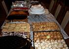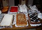 Spis ciast: * tort czekoladowo orzechowy z wkładką miodowo orzechową i czekoladową masą, a te małe zawiniątka pokryte białą masą to też torciki tyle że małe każdy z gości otrzymał taka porcje na talerzyk, nie trzebabyło męczyć się z krojeniem tortu, *to ciasto z czerwoną galaretk a to ambasador *obok ambasadora to sernik ze skórka pomarańczową *dalej z białym kokosem to rafaello * następnie krówka * ciasto serowo makowo jabłkowe *ciasteczka z pianką inaczej znane jako klawiszki *orzeszki *rurki z kremem ciasteczka grzebyczki *królewiec *kora orzechowa * i roladki śląskie będą podane jako danie ciepłe z kluskami śląskimi