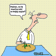 - Panie! Dlaczego trzyma pan palca w mojej zupie?