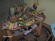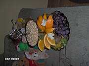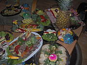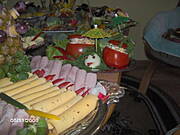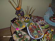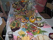 Nie chcę krytykować, ale jesteśmy stroną kulinarną więc myślę, że nie pogniewasz się jak napiszę parę uwag. Sprawa pierwsza: nigdy nie dekoruje się garmażerki "parasolkami" (służą one tylko do deserów i drinków). Po drugie dekoracja nie może być "przeładowana"....po trzecie nie wszystkie produkty można umieszczeć na jednej platerze. Po czwarte: nie należy zbyt dominować stołu ananasem, "kłóci" się on bowiem z wędlinami i serem. Po piąte: wszelkie dekoracje powinny być usystematyzowane i mile widziane jest wielokrotne powtórzenie takiego samego motywu na poszczególnych fragmentach (porcjach). Po szóste: wszelkie elementy pionowe nie mogą bardzo wyskakiwać w górę (to wprowadza chaos). Po siódme: wszystko co napisałem należy do dokonań profesjonalnych. Jak na amatorski wyczyn sąsiadki to pięknie, kolorowo i pewnie smacznie było.