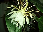A znacie takie cudo? Potoczna nazwa to "królowa...... " innej nie znam. Sama roslina to nic okazałego, natomiast kwiat - cudo, zapach - marzenie. Ewenementem jest to, że istotnie kwiat rozkwita w calej okazalości i od razu więdnie, dzieje się to w ciagu 1 nocy. Warto jednak czekać aby to zobaczyc i poczuć zapach. :). Widoczne na zdjęciu liście pochodzą od innej rośliny. :)