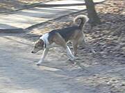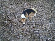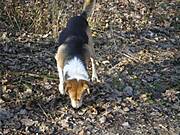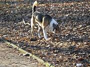 Jest to prawdopodobnie krzyżówka z "biglem" (nie wiem czy dobrze wpisałem nazwę rasy) i jesli tak to ...nieomal kocie nawyki: chodzić własnymi drogami i chce by gogłaskać i drapać do "upadłego" ...ale osoby wykonującej te czynności na rzecz leżącego bysia.