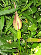 Znalazłam - to jest kwiat obrazków plamistych. Liścia widać tylko kawałek, to to po lewej. Pozostałe liście od innych roślinek, które się trochę rozrosły...