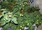 Ludziska kochane, moje pomidory oszalaly :)))) Oto zdjecia: Te dwa pierwsze zdjcia to krzaki doniczkowe, tak strasznie obrodzily, ze normalnie musialam przywiazac je do balustrady balkonu, zeby sie nie zlamaly pod ciezarem owocow. Nie mam pojecia ile jest owocow na jednym krzaku, Wspanialy chcial policzyc i sie nie dalo - zgubil sie po 30tce .... Szkoda, ze zdjecia tego tak nie pokazuja, bo owoce sa w wiekszosci pod liscmi :( A to jest nowa odmiana pomidorkow koktajlowych, a moze nie nowa tylko ja mam je pierwszy raz ;))) Jak pamietacie zawsze mialam koktajlowe zwisajace ze skrzynek balkonowych, a te maja takie karlowate krzaczki ale tak usiane owocem, ze ciezko sie do nich dostac ... wyglada to super :)))