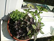 Tak właśnie wygladają moje bazylie w doniczce: b.właściwa, b.czerwona, b.czerwono-listna, b.grecka <to ta drobnolistna. (Zdjęcie wykonane 19.06.br.) Sadzonki wysiane były wczesną wiosną w pojeniku po margarynie, zgodnie z zaleceniem na opakowaniu i pikowane, gdy miały 3-4 listki, do zestawu na sadzonki (patrz wątek''moja działka'' < >zdjęcia sadzonek papryki). Tutaj po jednym krzaczku, reszta na działce.