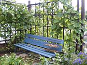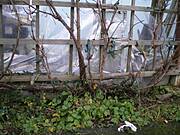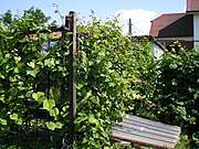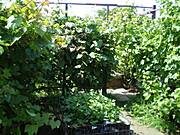 foto z dnia 01.lipca br - po lewej ciemna odmiana(9 letnia), szpinak na podwyższonej grządce, za nim winorośl typowo deserowa(7lat), po prawej właśnie odmiana jasna (15 letnia), w głębi widoczny fragment inspektu i nad nim również winorośl ciemna(3letnia). Całość na parę minut przed letnim cięciem, już po zawiązaniu owoców. Tu następne z innej strony ujecie: na po lewej pierwszym planie odmiana bezpestkowa, która chorowała przez cztery lata w tym roku dała mi pierwsze piękne duże owoce, dalej nad inspektem ciemna (ta 3letnia), po prawej deserowa (jak na poprzeniej fotce)