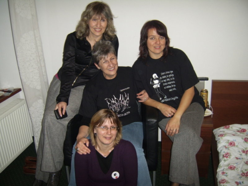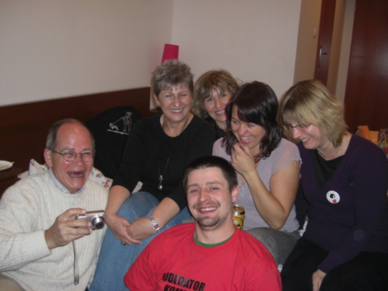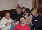 Już piszę. Na pierwszym zdjęciu mąż Marylki,Marylka,moja główka,Agnieszka,Beatka,no i Bodek.Fotkę strzelał Andrzej mąż Agnieszki.Fotka druga Andrzej,Charli czyta napis na koszulce Bodka ,Marylka.Fotka trzecia:Ja,Marylka,Agnieszka i Beatka.Fotka czwarta:Charlii i Bodek.