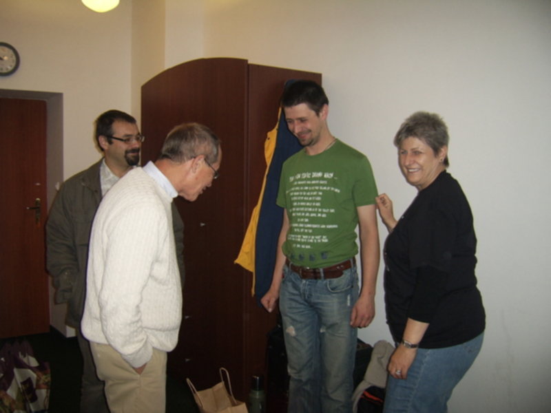 Fotka druga Andrzej,Charli czyta napis na koszulce Bodka ,Marylka.Fotka trzecia:Ja,Marylka,Agnieszka i Beatka.Fotka czwarta:Charlii i Bodek.