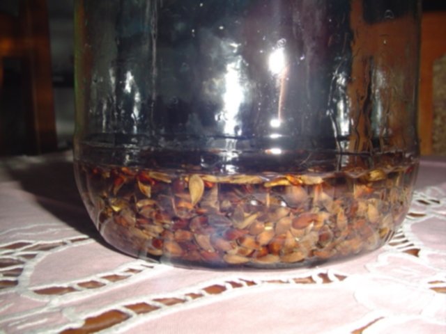 Kilka dni temu nastawiłam nalewkę z pestek z pigwy,długo nie trzeba zbierać,bo w jednym małym owocu pestek tyle co w kilogramie jabłek.Zobaczę co z tego wyjdzie.