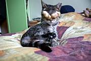 Na jednym z nich są również 2 pozostałe koty opiekuna - Beza i Bonifacy