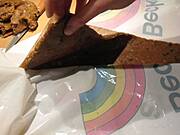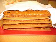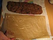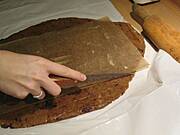rozłozyłam przeciętą torbę filiową, a na niej odpowiadający długości papieru, kawałek piernikowego ciasta