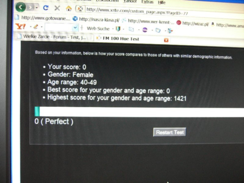 Petra, jak Ty buuuczysz, to ja Cię pędęm informuję , że najpierw miałam 19 punktów a za drugim razem 8. Na tym zakończyłam. Tak więc jak widzisz AS-em nie jestem . Nie mam pojecia jak oni to zrobili, że mieli "0" punktów. Moje gratulacje Normalnie, najnormalniej w świecie myślałam, że na czym jak na czym, ale na kolorach to ja się znam No i masz babo placek!
