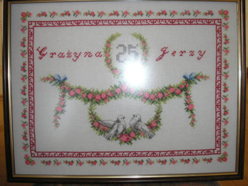 W zeszłym roku znajomi dostali od nas na srebrny jubileusz haftowany obrus i obrazek, który własnoręcznie wyhaftowałam krzyżykami.