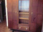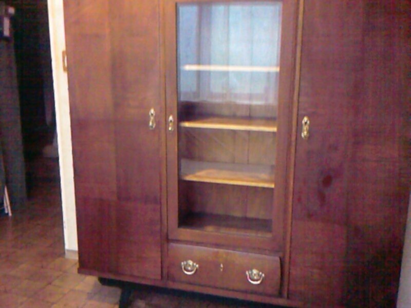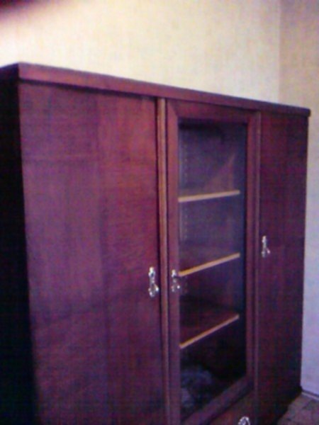 agik, taki mebel zwykle jest nazywany trzydrzwiową szafą biblioteczną /lub biblioteką/ z przeszkleniem.Brak jakichkolwiek ozdób wskazywałby raczej na b. wczesny okres powojenny/l. 40-50/, ale z kolei okucia raczej na koniec okresu międzywojennego. Czy są autentyczne /widać jakąkolwiek patynę?/. Co do forniru - zdjęcia są dość niewyraźne, ale jak przymknę oczy i spojrzę ponownie mam wrazenie,że widzę układający się wzór mozaikowy, ale czy gładki czy w kłos/ czyli zbiegający się pod ukosem ku środkowi/ to już nie. Nie jestem też pewna co do koloru na każdym ze zdjęć jest inny. Poszukaj może coś podobnego np na Allegro...