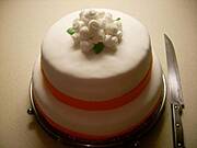 W efekcie choć masa była dość plastyczna i tort jakimś cudem udało mi się zrobić jako tako estetycznie, nie dawała się równo odkrawać ostrym nożem (spójrzcie na zdjęcie - jak wygląda dół sukni - jest postrzępiony). Niemożliwe było również sklejanie elementów - chyba że dzięki zagniataniu (tak powstały różwe kwiatki).
