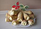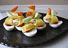 > jajek, swinki drożdżowe i sałatka z łososia, która miała być pralinkami