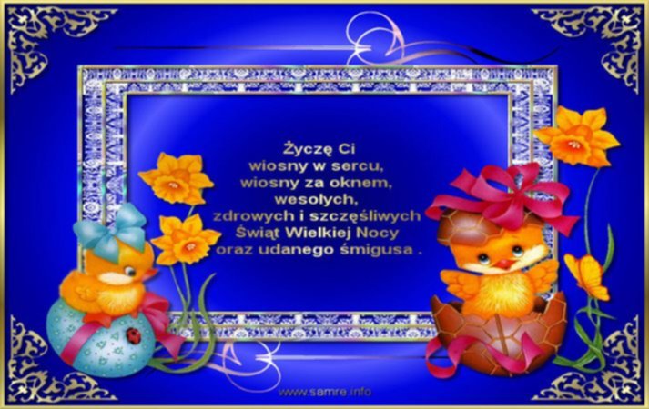 Z świątecznego korzystam zwyczaju, By przesłać życzeń tyle, ile kwiecia w maju I życzyć Ci naprawdę z całą serdecznością By święta napełniły Ci duszę radością! By Wielkanoc była jak bajka, a na stole nie zabrakło smacznego jajka! Życzę samych tęczowych pisanek, i Mokrego Dyngusa cały ranek...
