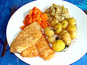 kotlet panierowany z indyka, młode ziemniaki, marchewka, kapusta na słodko kwaśno.