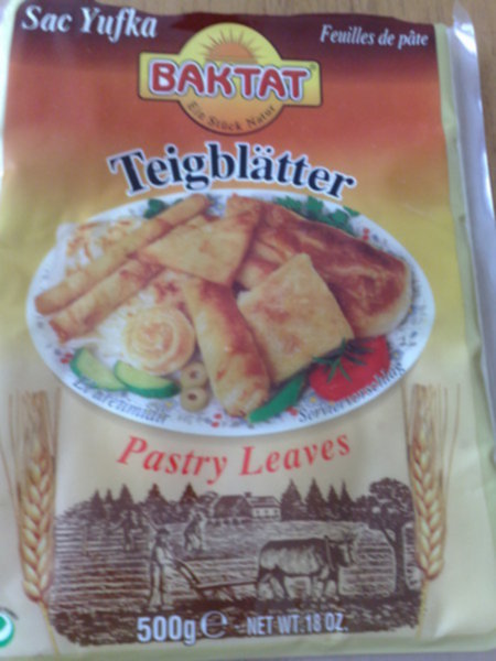 mozesz tez wziac 1 plat, posmarowac maslem, przekroic na 3 wzdluz (masz 3 dlugie paski), nalozyc farsz i zwijac tak, abys miala trojkat, to jest fajne, gdy masz gosci (nie musza siedziec przy stole nad talerzami, biora takie male kesy i szklaneczke wina i sa wolni), ciasto phyllo mozesz tez zamrozic i te "trojkaty" z nadzieniem rowniez, a tylko wstawic do pieca na 20-25 min. u ciebie to chyba bedzie 185-190 C (dobre dla niespodziewanych gosci),