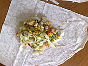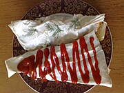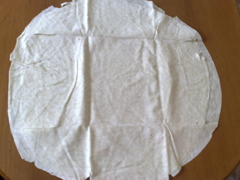nastepnym razem wez 1 plat (reszte przykryj zwilzona sciereczka, bo szybko wysycha) i posmaruj go stopionym maslem (pedzelkiem), nastepny plat - to samo, tak 5-6 platow (to jest bardzo cienkie ciasto i sie bardzo latwo rwie), teraz dopiero naloz farsz i albo zawin, albo przykryj nastepnymi 5-6 platami ciasta, to zalezy co robisz,