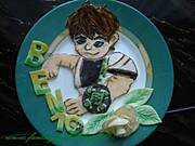wzięłam plakat mojego synka , odrysowałam Bena na papierze do pieczenia, zrobiłam mase cukrową ,którą rozwałkowałam na gruby placek i z masy wycielam kształt bena .Poczekałam az masa troche wyschnie . Pozniej czarnym barwnikiem za pomocą wykałaczki narysowałam kontury i pomalowałam całosc barwnikami .Ozdoby przykleiłam lukrem .