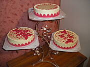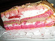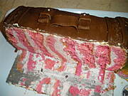 Aby wykonać wierzch kuferka potrzebne sa 2 spody biszkoptowe z 3 jajek upieczone w tortownicy 20Ø.Każdy spód przekroić na pół a następnie przekroić tak by powstały półkola po czym przekładac na przemian spód biszkoptowy i masa tak jak na zdjęciu powyżej