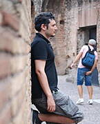 Ściągnął spodnie wypiął zakrwawiony tyłek w stronę lustra i robi opatrunek.