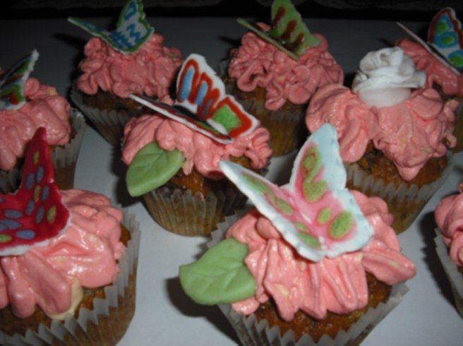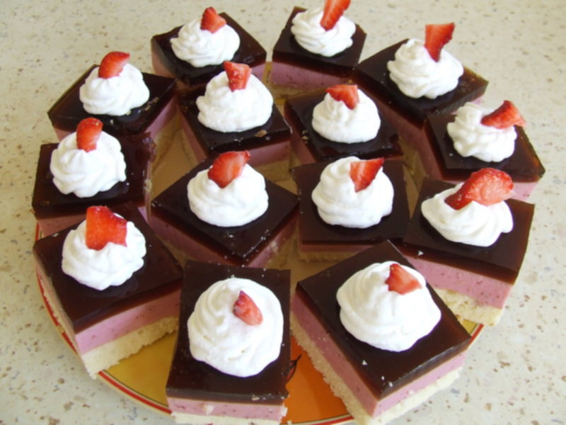 Ja znalazłam pomysł w internecie, udekorowałam tak muffinki. Ale kawałki ciasta pewie też można To różowe to zwykła masa budyniowa, a motylki można zrobić z marcepanu lub masy cukrowej. A jeśli ciasto będzie miało wierzch kruchy to polecam http://wielkiezarcie.com/przepis43241.html te różyczki są rewelacyjne i na pewno ozdobią każdy kawałek Twojego ciacha. Pozdrawiam.