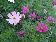Kwiaty to "Kosmos podwójnie pierzasty" - roślina jednoroczna, ale rozsiewa się i raz posadzona pozostaje w ogródku przez wiele lat.