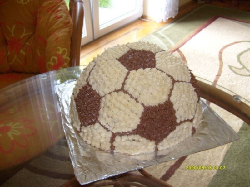 Hej umiecie zrobić tort w kształcie piłki . Ja myślę ze mozna by było wziąść padę róznych wielkości tortownic i złozyć w piłkę .tylko jak powycinać z masy marcepanowej te łatki czarno białe?
